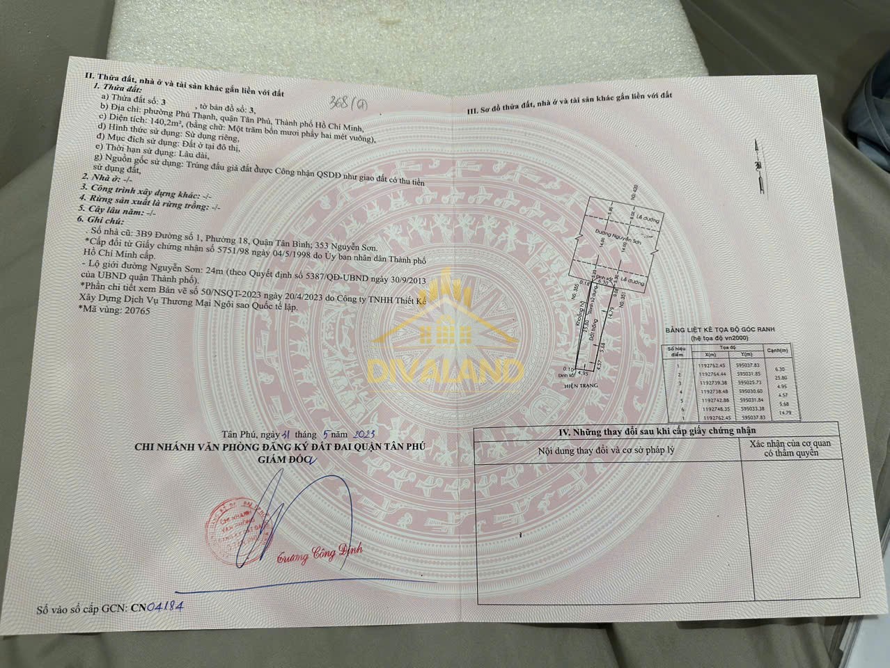 Công nhận: 140,2 m2 (Thổ cư 100%).